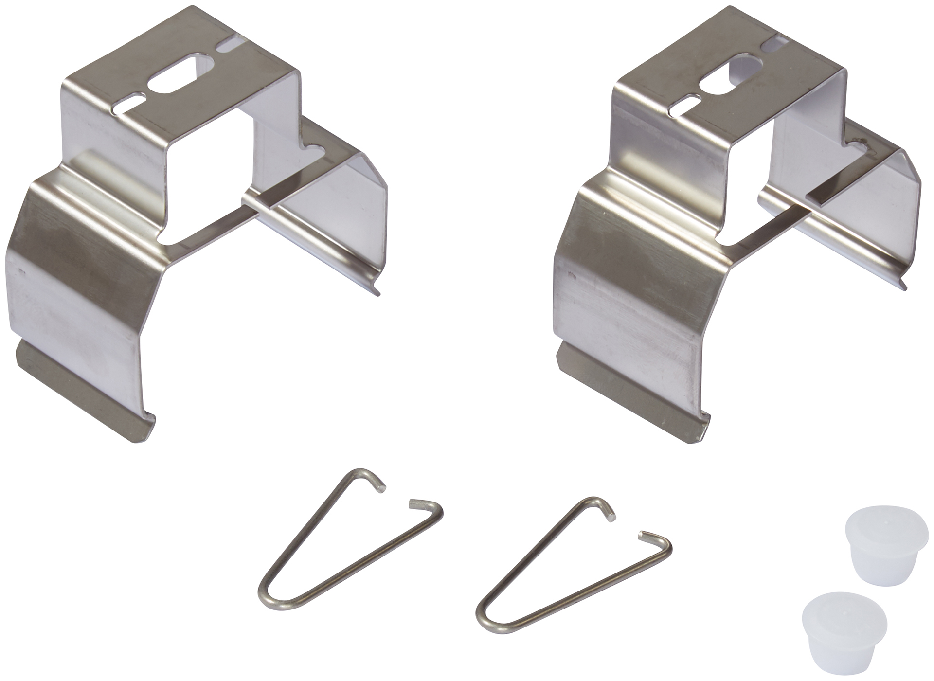 Befestigungssatz für EURO-FFL. Der Befestigungssatz enthält: 2 Halteklammern aus Edelstahl zum Aufklipsen, 2 Ketten-/Seil-Abhänger und 2 Verschlußstopfen.