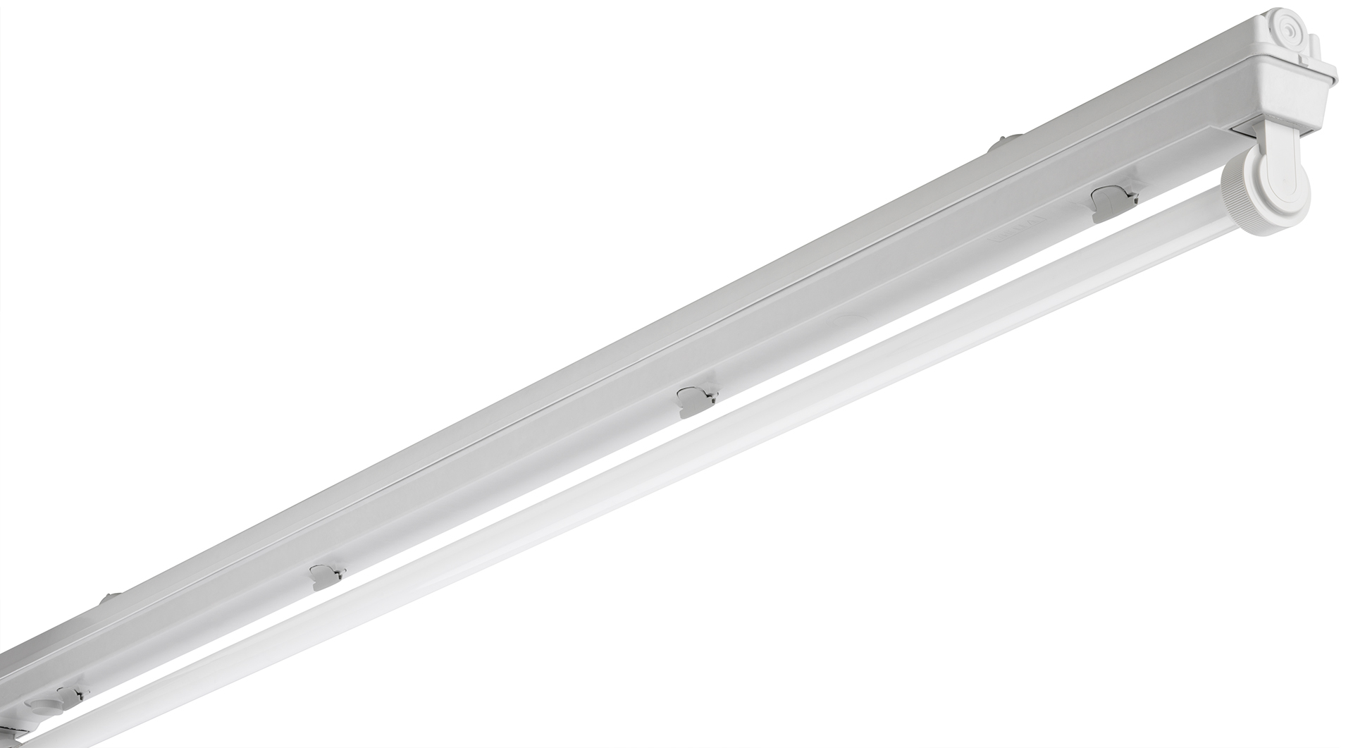 Feuchtraumleuchte freistrahlend IP65, Schutzklasse II, für 1xLED-Tube 1500mm. Ausschließlich für den Einsatz von ENEC/VDE zertifizierte LED-Tubes (LED-Retrofit) an Netzspannung 230V. Kurzschlussschutz durch eingebaute Feinsicherung. Inklusive Lampen-Schutzrohr (LS) aus Polycarbonat (PC) und Schraubringe. Gehäuse und Deckel glasfaserverstärktes Polyester, hellgrau, schwer entflammbar. Schnellverschlüsse mit 180° Drehung. Einführung (M20) und Würgestopfen für Netzzuleitung auf beide Stirnseiten. Anschlussklemme innenliegend stirnseitig. Zugelassen für den Einsatz in Innenbereichen oder überdachte Außenbereiche, für Decken- und Wandmontage (siehe Montageanleitung).