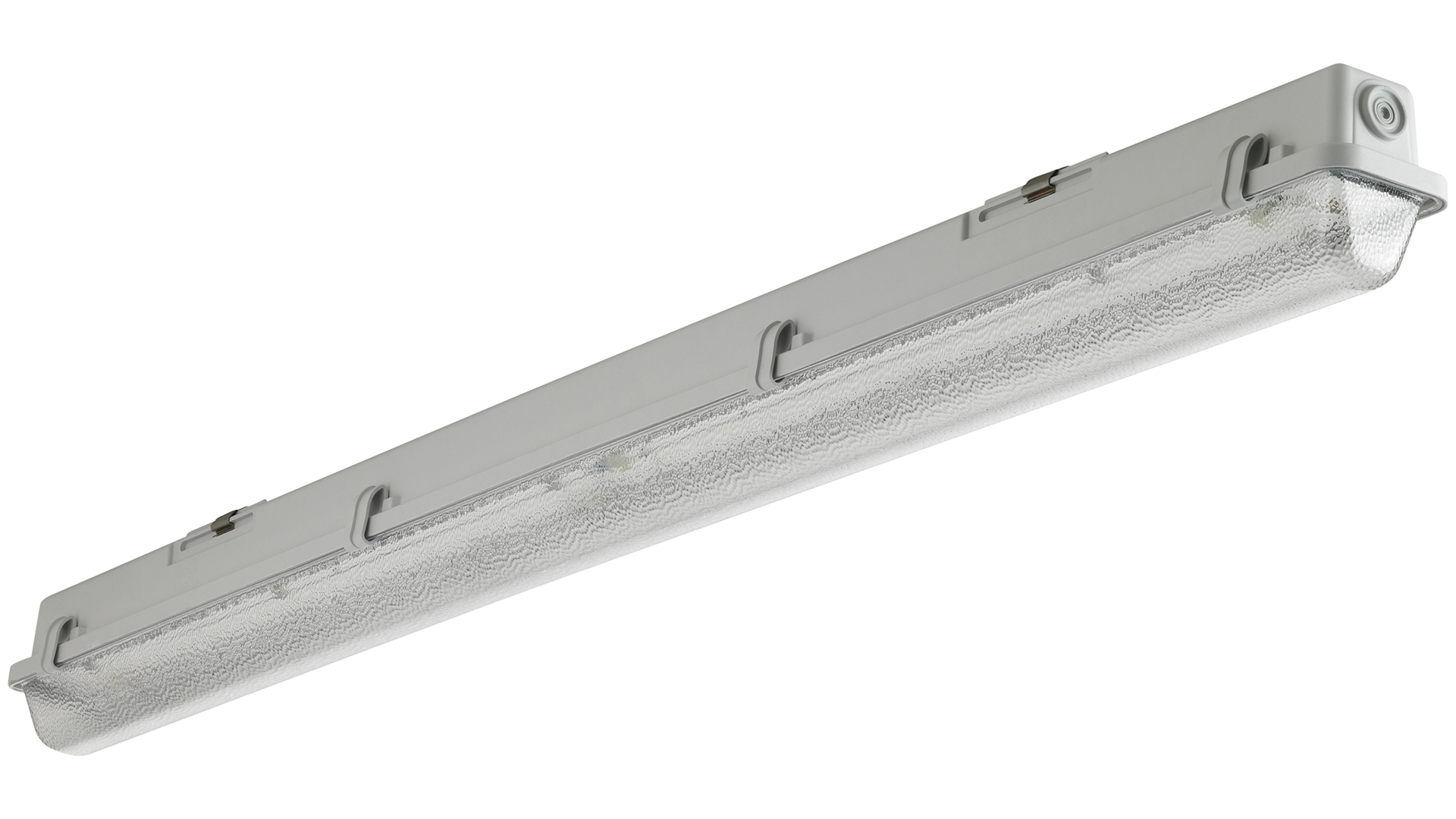 LED Feuchtraum-Wannenleuchte, mit einstellbarer Lichtleistung (MultiLumen, im Auslieferungszustand ist der Maximalwert eingestellt) und integrierter Durchgangsverdrahtung. Gehäuse aus schwer entflammbarem, glasfaserverstärktem Polyester (GRP) hellgrau. Alterungsbeständige, geschäumte Polyurethandichtung (PU). Mit integriertem LED-Konverter. Geräteträger weiß aus Stahlblech. Die LED-Module sind durch eine autorisierte Fachkraft austauschbar. Wanne aus UV-beständigem Polymethylmethacrylat (PMMA), glasklar, innen geperlt, aussen glatt. Wannenverschluss aus Edelstahl. Einfache Deckenbefestigung mit beiliegenden multifunktionalen Schnellmontage-Befestigungsklammern aus Edelstahl (Leuchte einklipsbar). Ausrichten der Leuchte durch den variablen Verschiebebereich um 60 mm. Leuchte mit begrenzter Oberflächentemperatur, für Bereiche, in denen leitfähige Stäube zu erwarten sind.