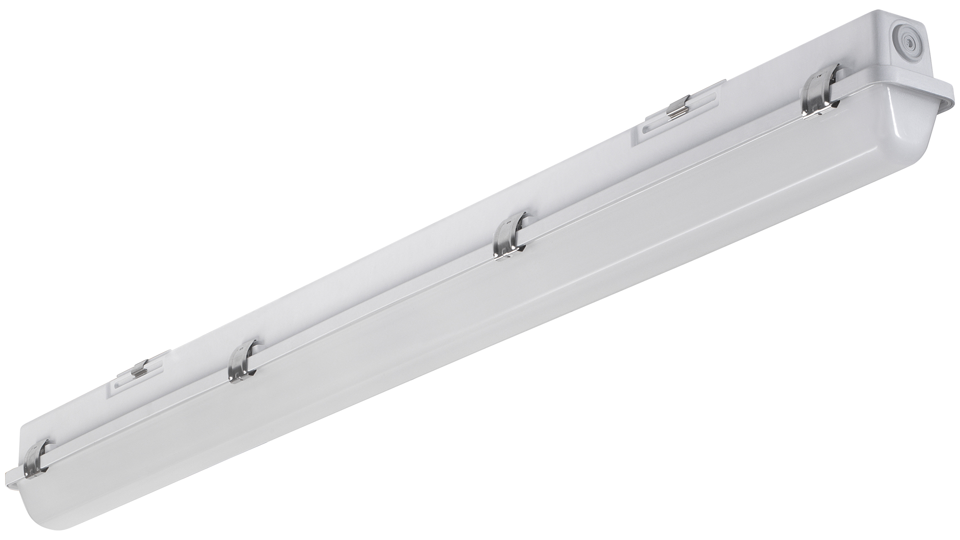 LED Feuchtraum-Wannenleuchte mit Durchgangsverdrahtung. Gehäuse aus schwer entflammbarem, glasfaserverstärktem Polyester (GRP) hellgrau. Alterungsbeständige, geschäumte Polyurethandichtung (PU). Mit integriertem LED-Konverter. Geräteträger weiß aus Stahlblech. Die LED-Module sind durch eine autorisierte Fachkraft austauschbar. Wanne aus UV-beständigem Polymethylmethacrylat (PMMA), opalisiert. Wannenverschluss aus Edelstahl. Einfache Deckenbefestigung mit beiliegenden multifunktionalen Schnellmontage-Befestigungsklammern aus Edelstahl (Leuchte einklipsbar). Ausrichten der Leuchte durch den variablen Verschiebebereich um 60 mm. Leuchte mit begrenzter Oberflächentemperatur, für Bereiche, in denen leitfähige Stäube zu erwarten sind.