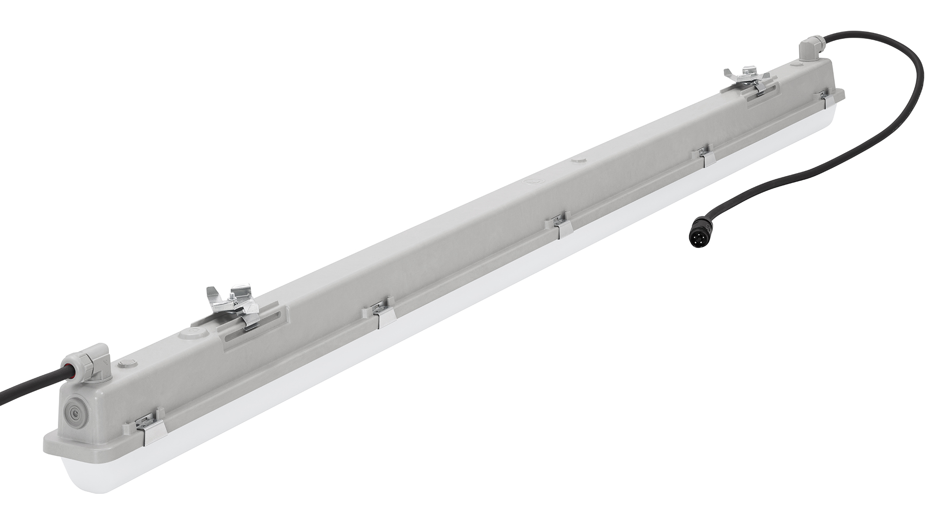 LED Feuchtraum-Wannenleuchte, dimmbar. Anschlussfertig mit Durchgangsverdrahtung. Zuleitung (mit Stecker) und Ausgangsleitung (mit Buchse) der Brandschutzklasse B2ca. Die Leuchtenhalter für unsere TRA-Tragschiene sind bereits montiert. Gehäuse aus schwer entflammbarem, glasfaserverstärktem Polyester (GRP) hellgrau. Alterungsbeständige, geschäumte Polyurethandichtung (PU). Mit integriertem LED-Konverter. Geräteträger weiß aus Stahlblech. Die LED-Module sind durch eine autorisierte Fachkraft austauschbar. Wanne aus UV-beständigem Polymethylmethacrylat (PMMA), opalisiert. Wannenverschluss aus Edelstahl. Leuchte mit begrenzter Oberflächentemperatur, für Bereiche, in denen leitfähige Stäube zu erwarten sind.