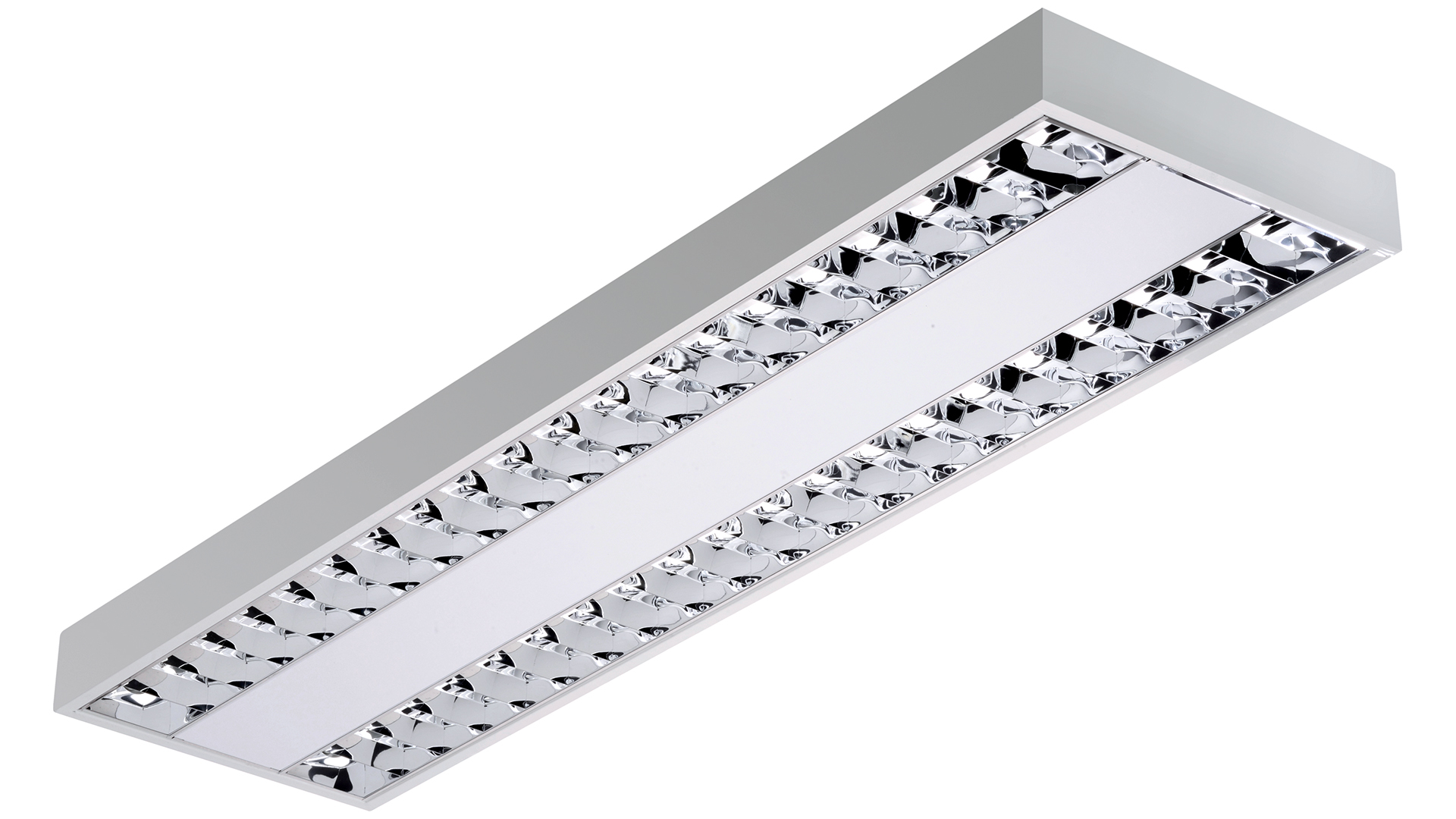LED Raster-Anbauleuchte. Stabiler Leuchtenkörper aus Stahlblech weiß, niedrige, zeitlose Bauform. Doppel-Parabol-Raster aus hochglanzpoliertem Aluminium, reduziert Blendungen, UGR<19, so dass an Arbeitsplätzen mit PC-Bildschirmen in Büros, Geschäfts- oder Gesellschaftsräumen für optimale Beleuchtung gesorgt ist. Geeignet zur Montage direkt an der Decke. Zugelassen für den Einsatz in Innenbereichen. Integrierte LED Leuchtmittel sind in der Leuchte nicht austauschbar.