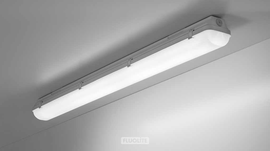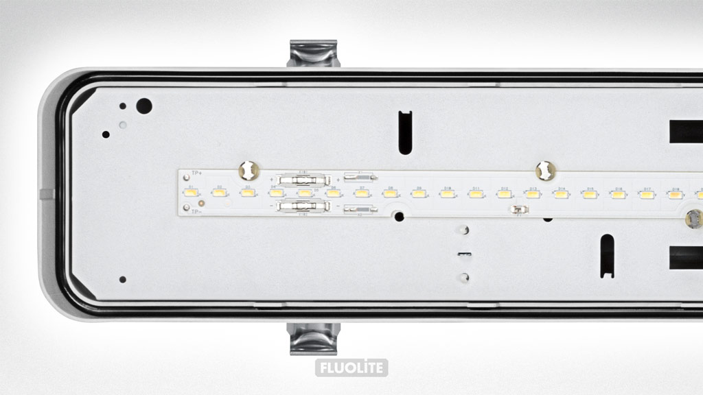 Leuchtenunterteil aus glasfaserverstärktem Polyester, hellgrau, schwer entflammbar. Alterungsbeständige, geschäumte PU-Dichtung. LED-Optiksystem auf weißem Geräteträger montiert. Opale PC-Wanne, schlagfest und UV-stabilisiert mit innenliegenden Längsprismen. Multifunktionale Schnellmontage-Befestigungsklammern aus Edelstahl (Leuchte einklipsbar).