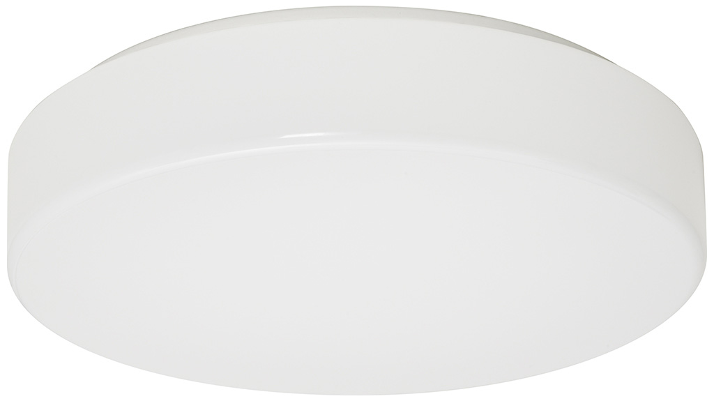 Leuchtenunterteil Stahlblech weiß. Flache zylindrische Wanne aus opalem, UV-beständigem PMMA. Sicherer Halt der Wanne durch Federverschluss. Steckklemme. Geeignet für die Montage an Wand und Decke oder abgependelt mit 3-Punkt-Seilabhängung.