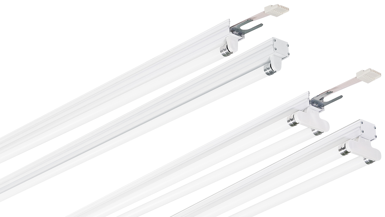 TRF Lichtleiste für LED-Leuchtröhren. Für den Einsatz von ENEC/VDE zertifizierte LED-Tubes (LED-Retrofit) an Netzspannung 230V. Tragschiene und Leuchtröhrenfassungen sind eine Einheit. Gehäuse aus profiliertem Aluminium mit Stecksystem und Schnellverschlüssen. Wahlweise in ein- oder zweiflammiger Ausführung, ohne oder mit integrierter Durchgangsverdrahtung.