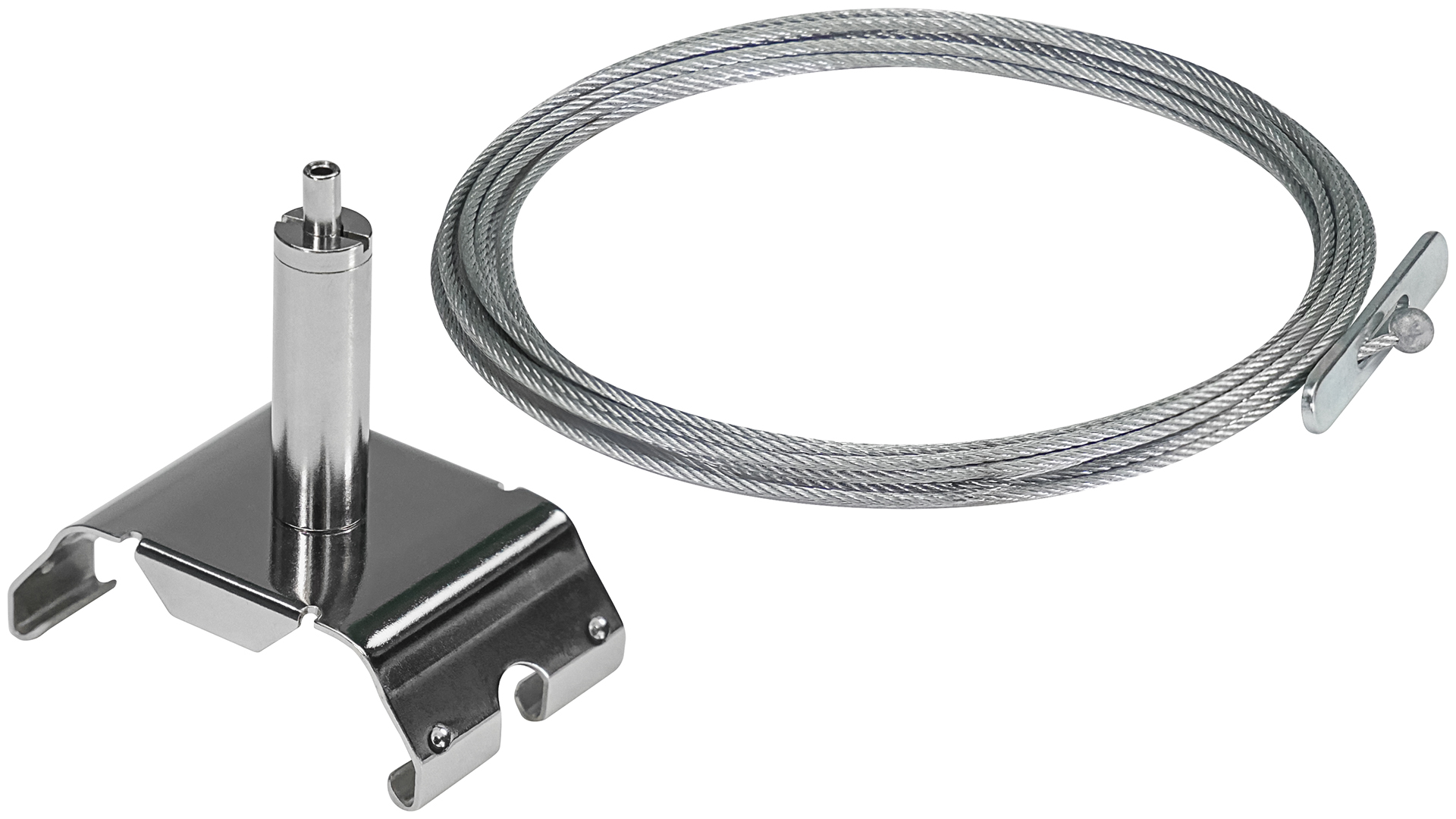 Halteblech mit Drahtseilhalter und Drahtseil. Werkzeuglos auf die Trageschiene aufzuklipsen. Zum Abhängen von TRF LINE Lichtsystemen. Stufenlose Höhenverstellung. Bei Lichtbandmontage werden, unter Berücksichtigung der Deckentraglast, je Lichtleiste 2 Befestiger benötigt